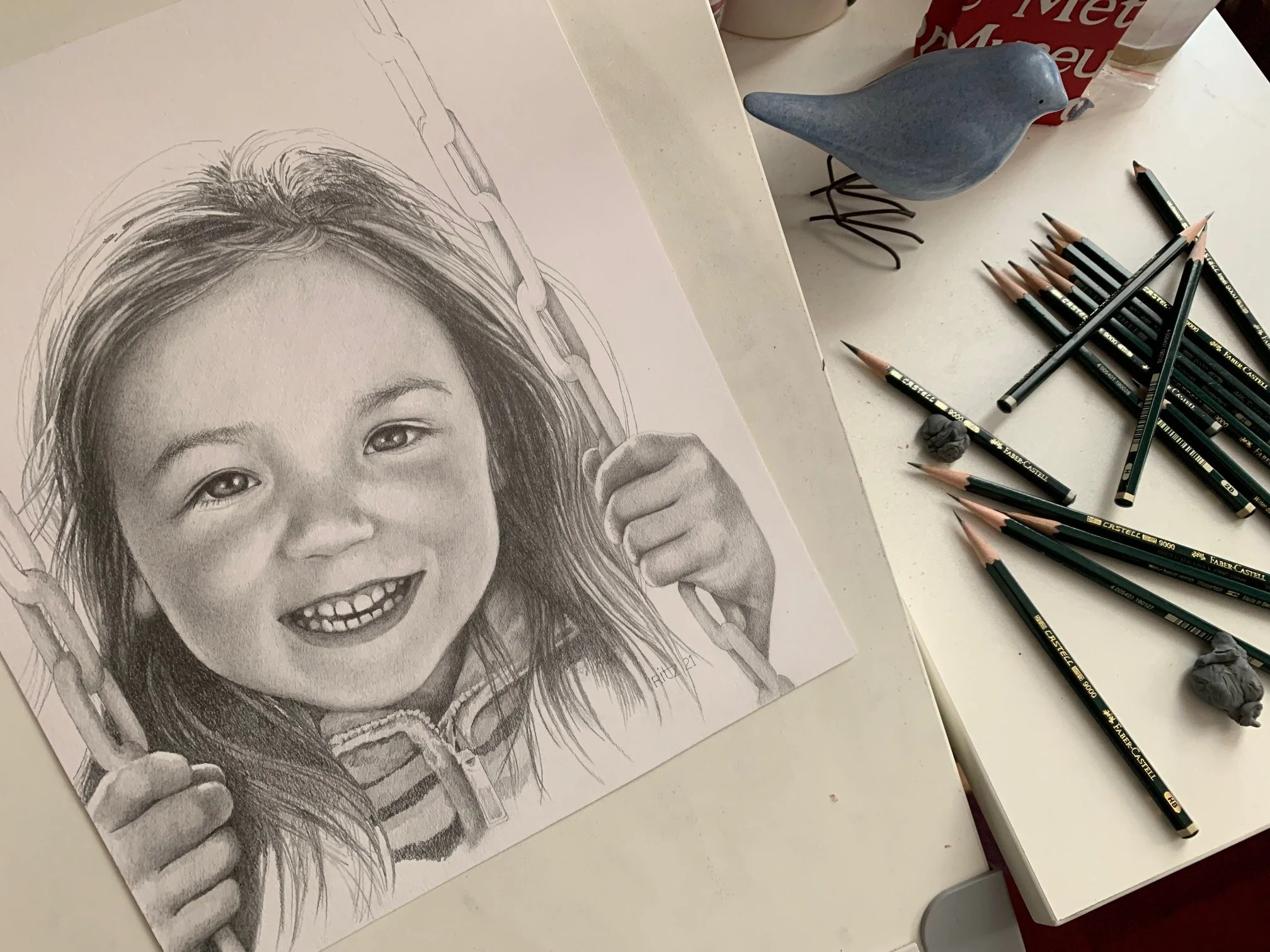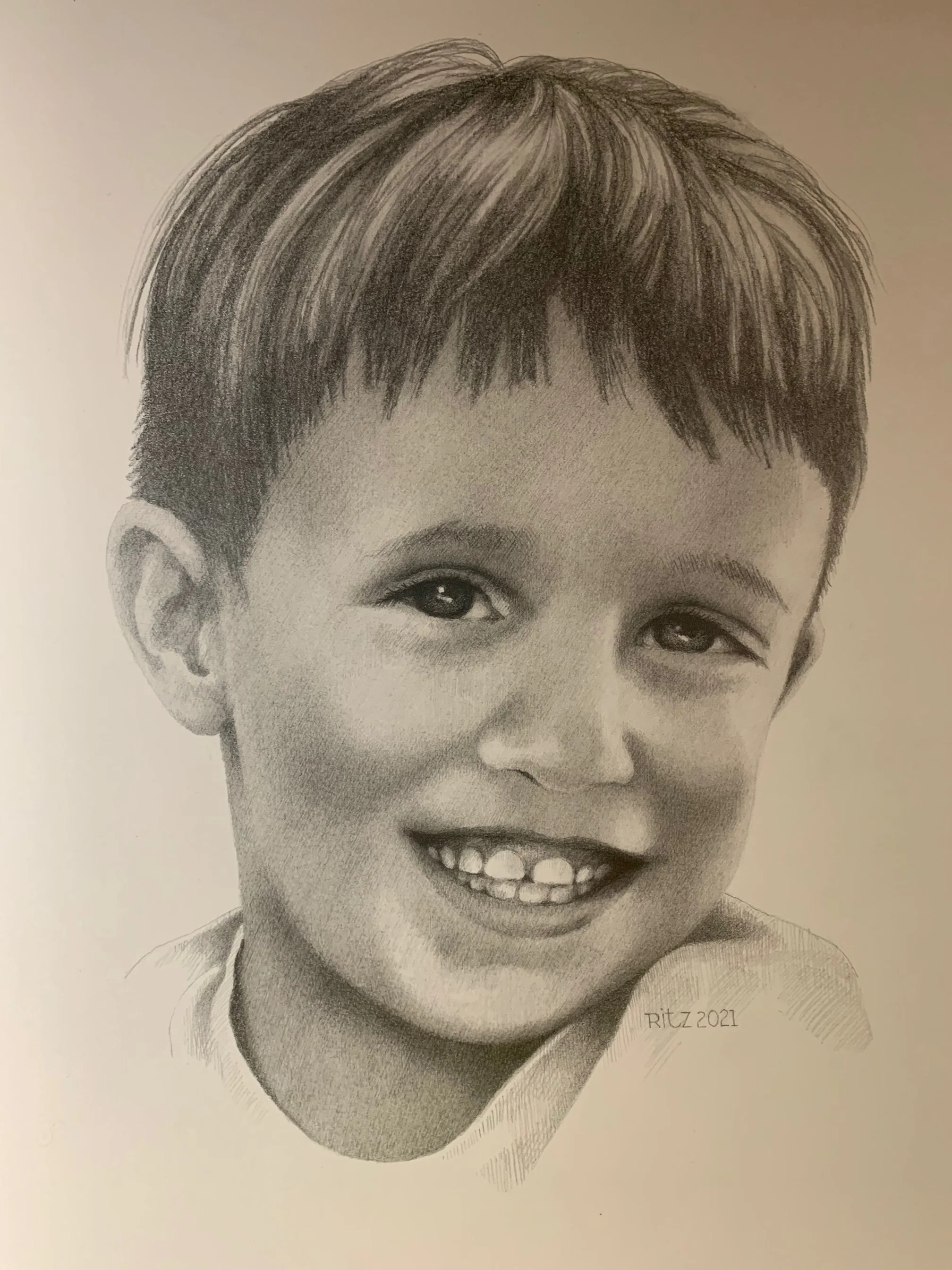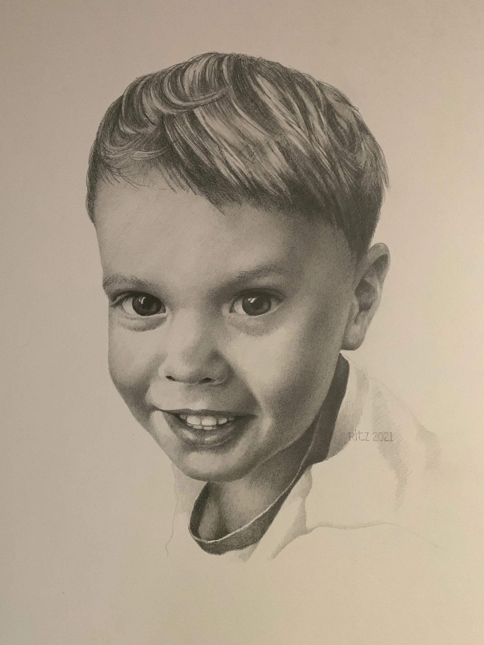Often, I am working from a series of favorite photos - perhaps you like the hair in one, but the smile in another. They don’t even have to be smiling (my Grands aren’t). Perhaps a “look” or age from a while ago captured your heart. I prefer to do one child per drawing as they are meticulously created as a keepsake to pass on - I feel family group photos are best captured by a photographer. One of my favorite customer comments is from a dad, some 20 years after, “Those portraits are what I would take if the house were on fire!” More recently, there have been videos - the 40-yr-old mentioned above cried, her mom cried, and me too, watching afterwards.
